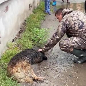 It begins on a rainy day—gray skies weeping over a quiet road where a large, muddied dog lay motionless, his body soaked with rain and coated in grime. Cars passed, but something about…