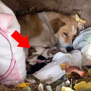 Body buried under the pile dirt, mother dog holding 7 puppies, desperately calling for help